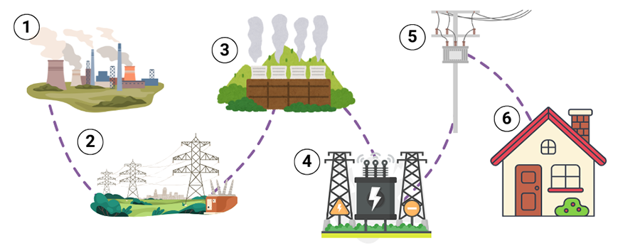 Step 5 | Transformers- Transformers are devices that change the voltage of electricity. They can either increase or decrease the voltage. This helps electricity travel long distances or be used safely in homes and businesses.